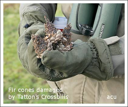 I finally caught up with Tatton's Crossbills on Sunday (28/12) Just 5°C this morning in Tatton but only a light easterly blowing, so it didn't feel too cold. I drove in about 11am and it was already crowded with the Christmas people - long coats, wooly hats, scarves and gloves carrying the obligatory plastic cup of coffee!I parked at the Melchett car park and walked to the Millennium Wood via the Old Hall, Swan Clump and the Mill Pool. Only the "usual" species, although I did see two Green Woodpeckers one of which was in full "song" from behind the pool. Millennium Wood seemed quiet - a few Blue Tits and single Goldcrest but I caught a quick glimpse of a Song Thrush and stood still hoping it would re-appear. It was then I became aware of "things" dropping into the leaf litter under a conifer on the edge of the wood. That could only mean one thing - Crossbills! I could make out about four birds at the top of the tree but I was looking against the light and my camera was struggling (there is a setting somewhere for back-lit subjects but I've never read the manual properly). I managed just one half-decent record shot of a male bird. Eventually the birds moved away but I did catch up with them as I walked back to the car park; there were 11 of them. eight flew back into the Millennium Wood and the remainder to the Swan Clump. I set merlin running when I was trying for a picture but all it came up with was Long-tailed Tit!! The birds were singing as well as just calling and I was looking forward to reviewing what merlin had captured and perhaps enhancing the sound. I had though failed to notice that Merlin has been "improved" and there's now a save button that has to be pressed if you want to keep the recording and it doesn't save automatically. Again, as they say in Amateur Radio circles, RTBM - read the ****** manual! I returned to the park yesterday morning (31/12) in the company of Karina, Jude and Phil A. It was a pleasant enough day, slightly overcast, 0⁰C ( -4⁰C overnight) but at least it was dry. We walked to Millennium Wood via Swan Clump and the Mill Pool. Nothing of note except a "yaffling" Green Woodpecker and a Great Spotted Woodpecker overhead. Despite spending some time in the wood there was no sign of the Crossbills but Tatton is a big place with conifers spread right across the park. Walking back towards the Old Hall we passed a lone conifer from where I saw them fly on Sunday, it has a good supply of cones and Phil gathered a selection from the ground underneath. As you can see from the picture they show typical damage caused when the birds prise them open to remove the seeds. My three companions had walked through Dog Wood and along the eastern shore of Tatton Mere on the way in, they paid special attention to the wildfowl as, the previous day, a male Smew had been photographed by a fisherman. Unfortunately it appeared to have moved on; at one time back in the 1970s they were regular Winter visitors to the park, favouring the Knutsford end of the main mere. Also on Sunday Geoff and Sheila Blamire were out and about doing the Winter bird survey .........." Spent the morning doing the 2nd visit for BTO UK Winter Bird Survey on our (BBS) tetrad. Had to do the survey before 31st December – 1-2 weeks ago would have been much too wet. The instructions said to choose a day without rain (drizzle is okay) and not windy (breezy okay) – quite difficult in the winter. Also we had to get permission to walk over a property which didn’t clash with any weddings – over Christmas was okay.