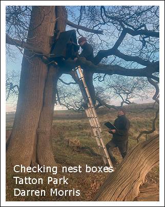 I have repaired the bird hide door today in preparation for your visit!Also, as you all enter the Dog Wood gate by the railway bridge, can any members spot the mistake on the poster attached to the gate? The one that explains about the wood being a SSSi "............ Thanks Darren and a good time to remind members that it's our KOS January field trip on Saturday (10/1) when we'll be doing a walk around the park, meeting in the usual Dog Lodge layby on Mobberley Road at 09:15am. With the approach of a storm, named Goretti by the French meteorological service, likely to bring heavy snow to our area on Thursday and Friday, as I'm the trip leader this time, it's more important than usual to let me know if you're coming along. (tony.usher@zen.co.uk or 07710508544) in case there is a last minute change of plan. I did a recce yesterday (6/1) of part of the proposed walk. "-7.2°C overnight but by 11:00am it was a balmy 0°C. I had hoped to park at the Knutsford entrance and walk down to the west side of Tatton Mere where Darren had reported so much activity yesterday (5/1) but unfortunately the Knutsford entrance was closed to motor vehicles due to ice on the Knutsford Drive. So it was plan "B" and I parked at the Dog Lodge layby and walked through Dog Wood as far as the concrete jetty below the Outdoor Centre. There was plenty going on and I was greeted by the sound a Great Spotted Woodpecker drumming on the dead branch of an oak tree close to the gate. As well as the anticipated Blue, Great and Coal Tits, numerous finches were feeding high up in the trees alongside the path down through the wood; against the light but I did manage to pick out Goldfinches and Siskins and, at one stage, I thought I heard a Brambling call.Lower down and much easier to see, numerous Dunnocks with Blackbirds and a Song Thrush scavenging amongst the leaf litter. Moving on I could see the strips of clear water that Darren had described on the far side of the mere, I only found Mute Swan, Mallard, Coot, Tufted Ducks and Canada Geese. I could see people walking along the far bank, a good sign that meant that, although the drive was closed to vehicles, pedestrians had access and this will hopefully be the case on Saturday for our January field trip. I was in the park again this afternoon (7/1) doing another "semi-recce" when I met Darren and Saul checking some of the nest boxes in Dog Wood" .........."We did one of the jobs that I will miss today; checking the bird boxes and cleaning them out ready for spring. We have a variety of 30 boxes targeting species such as blue and great tit, nuthatch, spotted and pied flycatcher and robin. There are also several barn owl boxes mainly in the deer sanctuary. While out today we saw three stonechats, three woodcock and a green sandpiper in the deer sanctuary. Two of the young rangers are pictured checking the boxes. "................ Thanks Darren, it won't be long now!! I've set the 2026 Sand Martin competition in motion, you can find details and enter by clicking the link at the top of this update or you can click here. As usual it's free to enter (only one entry per person please) and there will be a small prize for the winner. It's open to anyone, not just KOS members and you can read more on the link provided. Any KOS member not entering will be hung upside down over a picture of Donald Trump. Other politicians are available! Finally, once again a look back at what we were up to at the end of the last century!! ......"10/01/99 At last some "decent" Winter weather with sub zero temperatures for the last few days, the Christmas holiday period was marked by mild, wet and windy weather ideal for the incubation of the latest 'flu virus which seems to have flattened most of the population of North-west England for up to a week at a time. The first trip of the year today found us in Tatton for an easy morning walk, the weather was crisp and sunny and prompted some early song, Mistle Thrushes have been prominent for some time now they were joined today by a Song Thrush on Knutsford Moor. The Moor pool itself was frozen over, moving the resident Teal onto Melchett Mere and forcing a couple of Water Rails out of the reedbed where they were feeding along the unfrozen feeder stream. Green and Great Spotted Woodpeckers were both much in evidence the latter already drumming loudly in Dog Wood where we watched a pair of Kestrels in display flight, a superb sight in the cloudless Winter sky."...... 1st January 2026 ......... A splendid end to 2025.
