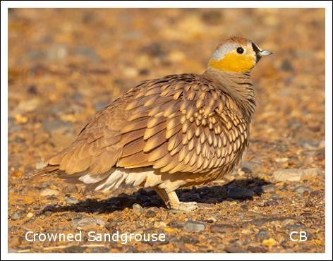 Hamid drove us a short way to where there was a leaking hose pipe in what appeared to us to be the desert but presumably was an area where things were being grown, possibly melons. The escaping water was attracting more Crowned Sandgrouse, and we stayed here a while enjoying these. In the area also were several Cream-coloured Coursers, which were really nice to see well after the distant ones in Fuerteventura and also Morocco last year.