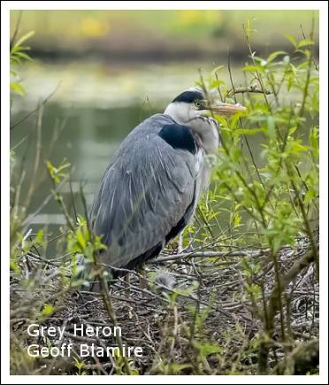 Little Mere: 4 Grey Herons (including 1 on the nest), 2f Goosander, 2 Egyptian Geese, 2m 1f Gadwall, etc.