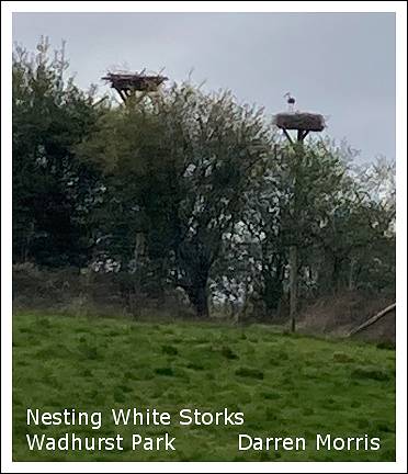 Out and about last Sunday (12/4), Geoff and Sheila Blamire were again finding Whitethroats - I've yet to come across one this year but, hopefully, that will be rectified tomorrow on our trip to Brockholes, we've never had problems finding them there ........."This morning (12/4) we did our walk around Holford and Plumley and taking another diversion to a new area. Species seen: male Wheatear and Green Sandpiper (new birds or the ones from last week?), pair Oystercatchers, Shelduck, pair Gadwalls, Lapwing, Snipe (flushed), Whitethroats (2 sites), Linnets (2 sites), Chiffchaffs (several), Blackcaps (2 sites), Swallows, and Mallards with 10 tiny ducklings. Driving back, by the side of the road, tiny Moorhens chicks and Guinea fowl!"...............A quiet morning at Rostherne on Monday (13/4)(nothing unusual there!) but we did see the female Common Scoter feeding just in front of the boathouse. Pete Kelly's striking photo of the bird is reproduced on the left - not the usual bird-on-a-stick image! More going on the following morning (14/4) on our local patch in Mobberley when I walked from home down to Gleavehouse Pool. I was hoping for a Wheatear or more Yellow Wagtails but found neither, unlike Peter Dawson who I met along the way - he'd not only seen Mobberley's first Wheatear of the year but also Curlew and Golden Plover! Peter has moved house from the centre of Knutsford to the new Redrow estate on the edge of the town and he spends a lot of time in the fields off Sudlow Lane. At the pool, a dozen or so Sand Martins from their nearby colony, plus passing Swallows and House Martins. The original 12 ducklings from family #1 are now 7, I glimpsed the other family but didn't manage to count them. My bird of the day was a singing Lesser Whitethroat, it was hidden away in the thick hawthorn hedge leading down to Gleavehouse pool and I was able to approach to a position only a few yards away. I was puzzled to find that the Merlin app just didn't recognise it, despite the fact that it was so loud and clear. I have uploaded the recording and you can hear it by clicking here. (you may have to turn your sound up a bit.)The Lesser Whitethroat is my favourite bird and I was really pleased to come across one so early in the season. Last year I had only one, a bird heard fleetingly, close to the same location. On the same morning (14/4) Darren Morris was on Knutsford Moor .........."I heard my first Willow Warbler singing from the willows on Knutsford Moor. Later, two oystercatchers and plenty of Swallows and Sand Martins in Tatton plus two broods of ducklings. I have been watching a pair of Nuthatches nesting in Moss Wood and a few days ago witnessed a Great Spotted Woodpecker at the hole entrance predating either eggs or chicks. It was then very quiet for a few days but today the Nuthatches are back and look like attempting to nest again. I’m just back from Wadhurst Park in East Sussex and it was pleasing to see the White Storks nesting. The picture above shows their nesting platforms; the whole area is fenced off to protect them from predators but they are free-flying. There are some that are ground nesting as these are rescued injured birds...... Darren"............ I went down on the Moor early on Thursday morning (16/4); I heard my first Reed Warbler of the year singing from somewhere deep inside the phragmites and also a Water Rail chipping from the same area. Merlin had no problems with this and you can hear it by clicking here. Bob Groom was also in the park on Thursday ..........."I was in Tatton PM and it was almost deserted. Not good for revenue. Maybe people are conserving their petrol. The mere was almost end to end sand martins. Difficult to put a number on it but 200 probably a conservative estimate.."............. G&S were out on one of their usual stamping grounds ........."The usual species around Mere and Millington this morning so just the highlights: The Whitethroat, which is around for nearly 3 weeks now, was singing, giving song flights and occasionally giving alerts. Found another Whitethroat site in a great area with brambles and bushes, also with Linnets and Long-tailed Tits. And a Buzzard on its nest which we found a week or so ago. "............ Like most KOS members Geoff and Sheila began their daily walks during covid, in 2020. Geoff has kept a record of the distances covered each day and this week their cumulative wanderings found them in Mozambique! I see that the RSPB is offering life memberships for the bargain price of only £910. I'm currently paying £41 a year, so in 22 years I'll be in profit. I know someone who will do the maths! Winters from long ago were a bit colder than now, as we found this week in 1998. "14/04/98 We often get periods of cold weather with snow showers at this time of the year but the current spell of arctic conditions is more prolonged than in recent years and could be posing real problems for our Summer visitors. Both Chiffchaffs and Blackcaps have of course returned and I was watching a Chiffchaff nest building a week ago, but no song was heard from either species as we walked down to Tatton Mere tonight in a blizzard! A group of c.60 Sand Martins were flying low over the Mere accompanied by c.5 Swallows but no sign yet of any House Martins - these pioneers were feeding on dipterans emerging in their thousands on the surface of the Mere even in such cold weather. Unaffected by the conditions were a flock of Bramblings feeding in Oaks near to the Outdoor Centre and the Crossbills in Swan Clump watched at close quarters today by some friends." 11th April 2026................ More Summer visitors